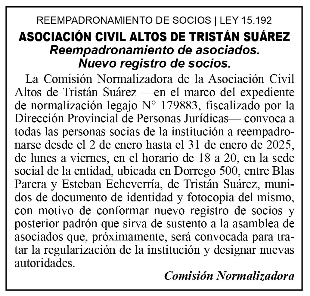 En el marco de la normalización de la Asociación Civil ALTOS DE TRISTAN SUAREZ (clic para ver más) se convoca a todos quienes participan de las diversas actividades a reempadronarse para oficializar a quienes son socios.