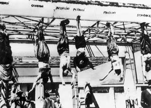 Tras una dramática fuga de la cárcel, Mussolini huyó a la Italia ocupada por Alemania, donde, bajo la presión de Hitler, formó un débil y efímero estado títere. El 28 de abril de 1945, cuando se acercaba la victoria de los Aliados, Mussolini intentó huir del país. Fue interceptado por partisanos comunistas, que le dispararon y arrojaron su cuerpo en una plaza pública de Milán.