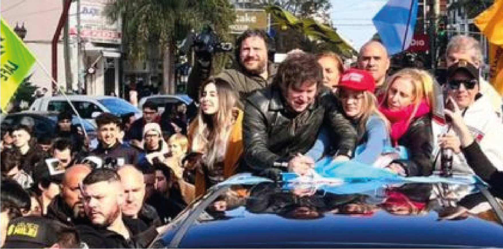 Adelante, encabezando la caravana, en un vehículo, Milei flanqueado por Karina, su hermana, por la candidata a Gobernadora Carolina Píparo, con un exultante Sebastian Pareja, con el “DIPY”, Con el candidato a Intendente de Ezeiza Pablo LOPEZ, autografiaba lo que le alcanzaban los militantes, hasta una caja de un repartidor que necesitaba llevarse un recuerdo. Otro exhibía un billete de mil pesos con el autógrafo. Todo alegría.