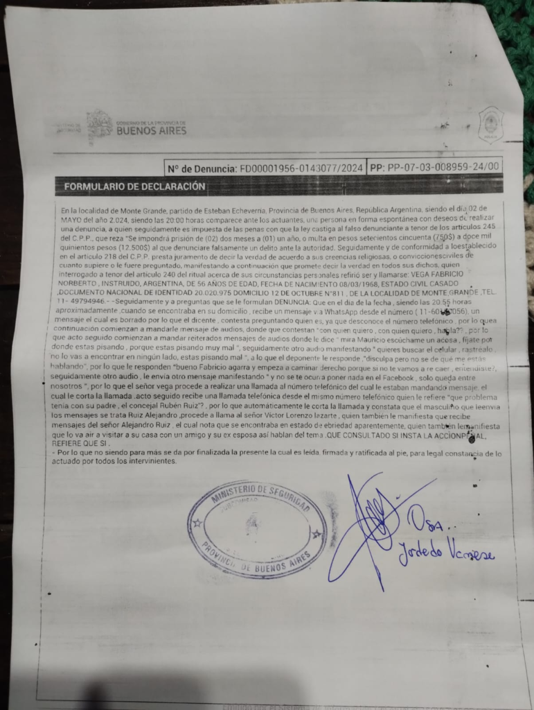 Tanto Fabricio Vega, como Victor Lazarte y Mateo en la noche del jueves 2 de mayo fueron amenazados por este concejal y su hijo. (Los audios están reservados). Las cosas llegaron al extremo de tener que acudir a la justicia denunciando el hecho.