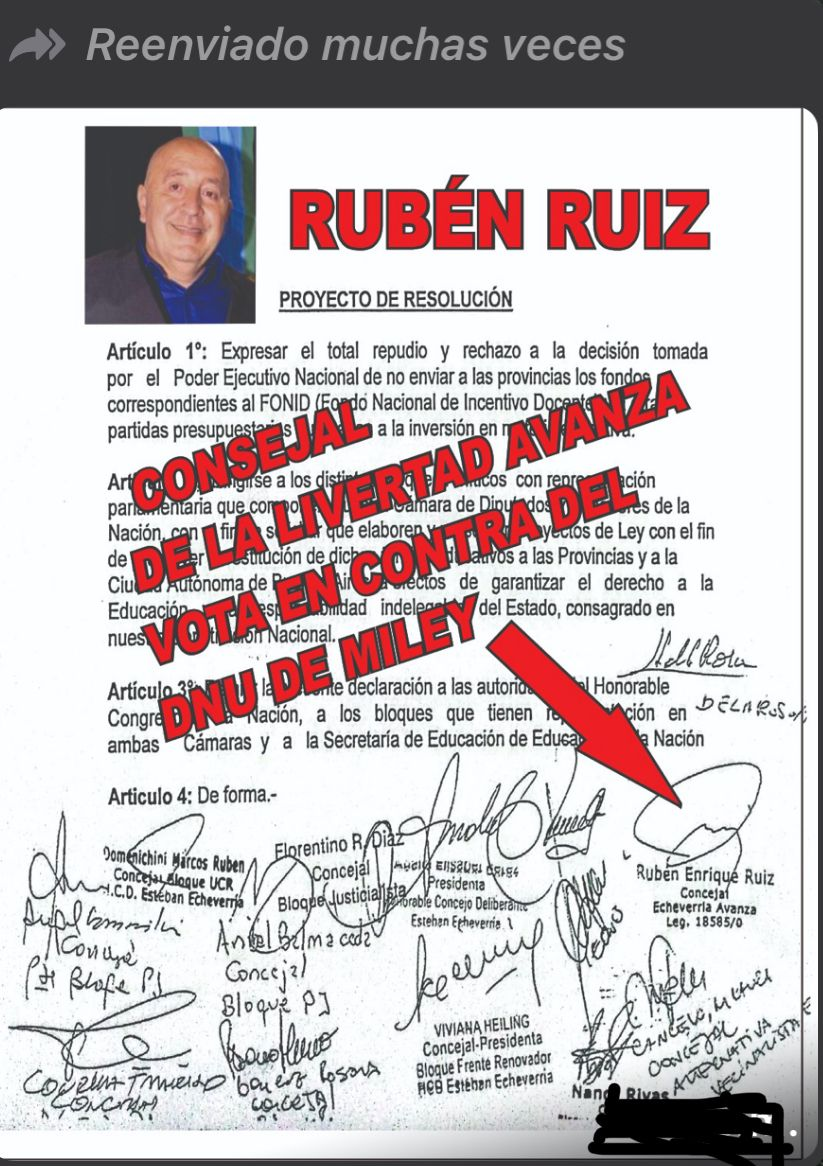 Unos de los concejales que logró colar en esa boleta que llevó a Milei a la presidencia se llama Rubén Ruiz. Casi al asumir rompe el bloque compuesto, además, por Vanesa Gioia (esposa del senador provincial Carlos Curestis LLA) y Facundo Quiroga, de ese modo arma el monobloque “Echeverría Avanza”.