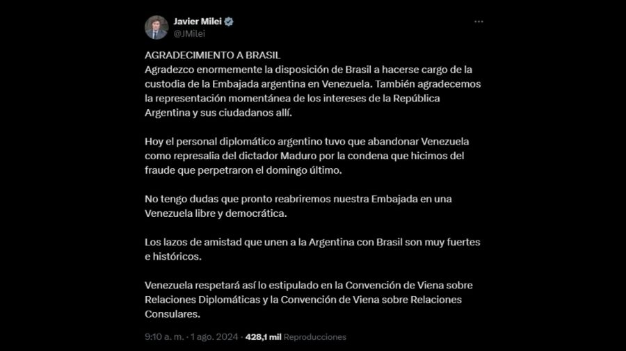 En función de ello el presidente Milei le agradeció a Brasil «por hacerse cargo de la custodia de la embajada argentina» en Venezuela. De este modo, en un gesto poco habitual en su vínculo con Lula, agradeció a través de sus redes sociales la decisión del país vecino de cuidar los intereses argentinos en Venezuela.