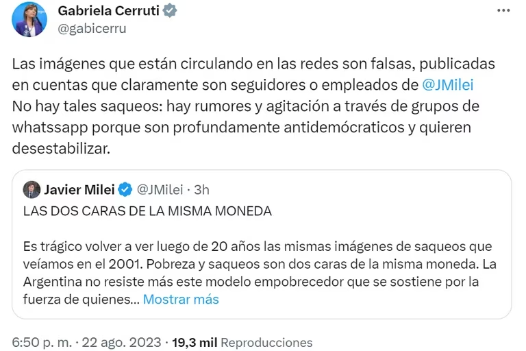 “No son espontáneos, no es una casualidad, si yo tuviera quién está detrás, hubiese empezado por ahí. No tenemos datos fidedignos para decir que fue fulano o mengano, yo no lo puedo decir, ahora si otra persona del gobierno (REFIRIENDOSE A CERRUTI) lo hizo sabrá por qué lo hizo”, aseguró Fernández.