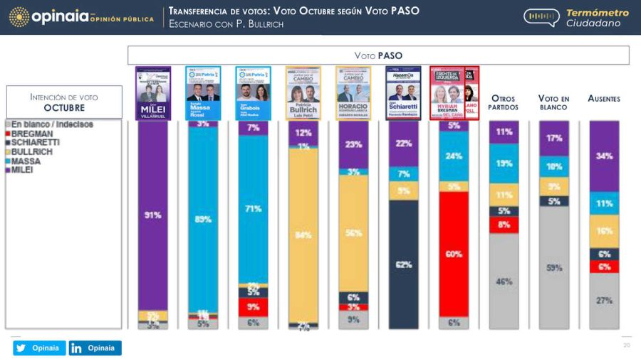 Una encuesta nacional sobre las elecciones generales reveló que un porcentaje de los votos de Horacio Rodríguez Larreta no migrarían para la candidata presidencial de Juntos por el Cambio (JxC), Patricia Bullrich, sino que se trasladarían al postulante de La Libertad Avanza, Javier Milei. En ese sentido, el dirigente libertario sería el candidato que mayor retención de voto obtendría.