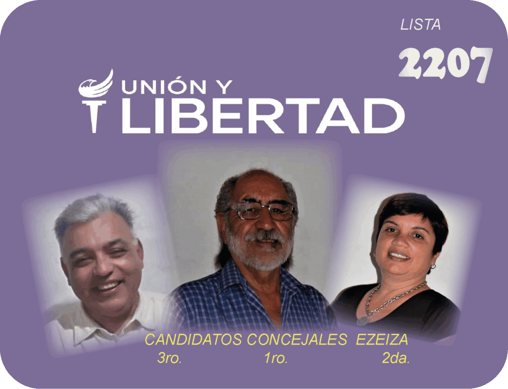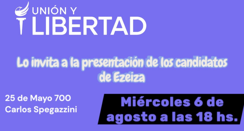 Esta tarde, en el salón de eventos ubicado en 25 de Mayo 708 de la localidad de Carlos Spegazzini, Ezeiza, a partir de las 18 horas se presentarán los candidatos del espacio UNION Y LIBERTAD Ezeiza.